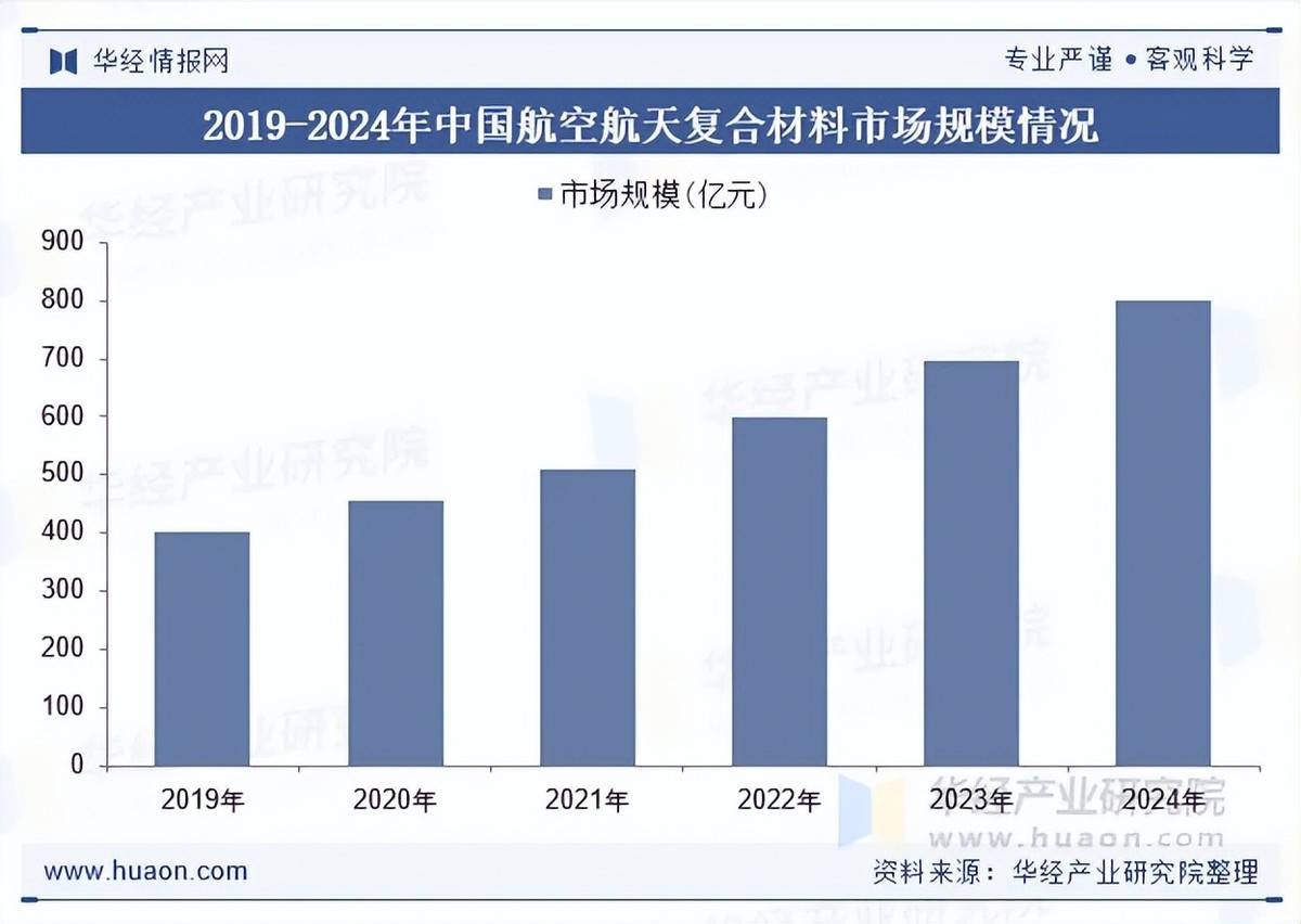 航空航天工业作为国家科技实力与战略安全的标杆领域,其材料体系的升级直接决定着装备性能与产业竞争力,伴随着航空航天装备向高超声速飞行、深空探测、空天往返等极端环境拓展,传统材料已难以满足轻量化、耐高温、抗辐射等需求,因此,在航空航天领域,采用轻质高强复合材料实现轻量化已成为大势所趋。2024年,中国航空航天复合材料市场规模大约增至800.4亿元。